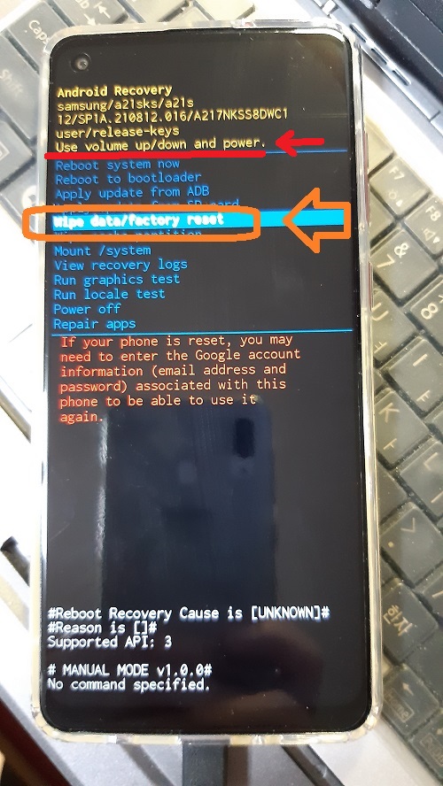 볼륨업 혹은 볼륨다운 버튼을 눌러서 "Wipe data/factory reset"을 선택한 다음, 전원 버튼을 누르자.