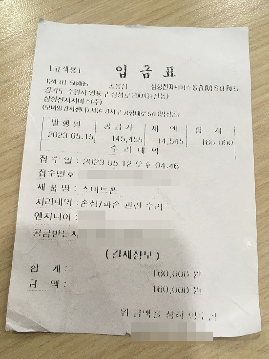 총 수리비는 160,000원이지만 KT 통해서 20% 할인받아서 128,000원을 지불했다.