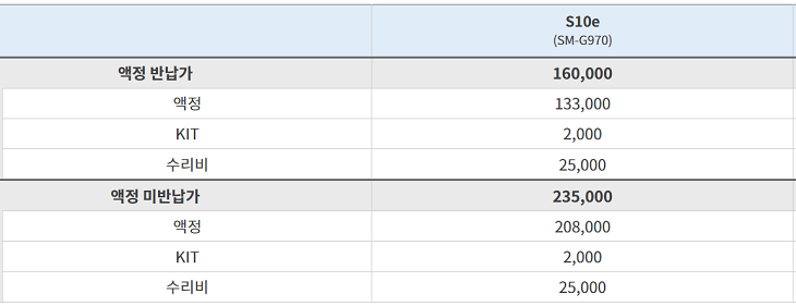 2023년 5월 기준 갤럭시S10e의 액정 수리비는 액정 반납가 16만원, 미반납가는 235,000원이다.