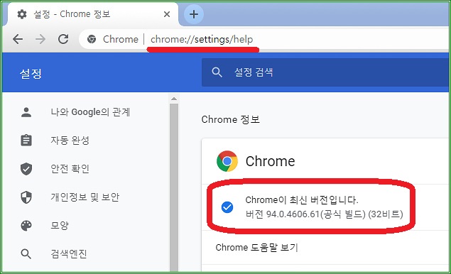 우측 상단 점점점-도움말-"Chrome 정보"를 클릭하거나, 주소 입력하는 부분에 chrome://settings/help를 입력하면 버전을 확인할 수 있다.