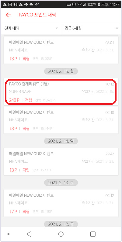 고지한 대로 2021년 2월 15일에 천원쿠폰이 아닌 슈퍼세이브 결제리워드 포인트가 적립되었다. 아쉽다.