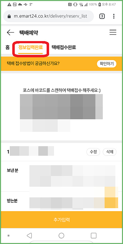 예약한 택배 내역은 "정보입력완료" 탭에서 확인할 수 있다.