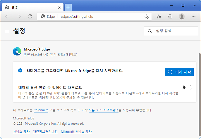 주소 입력하는 부분에 edge://settings/help 입력하고 엔터키를 친 다음 업데이트가 완료되면 브라우저를 재시작하자.