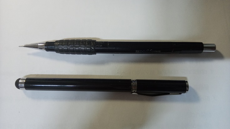 정전식 터치펜과 문구점에서 흔히 판매하는 천원짜리 제도 샤프와 크기 비교.