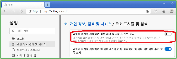 "입력한 문자를 사용하여 검색 제안 및 사이트 제안 표시"를 끄면 자동 완성 기능도 꺼진다.