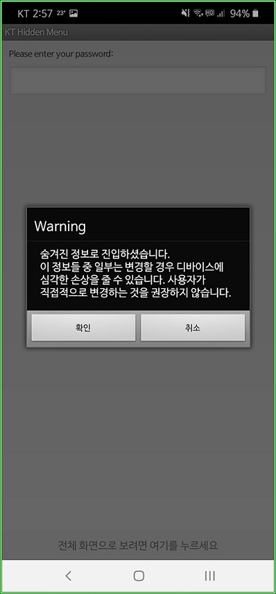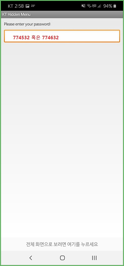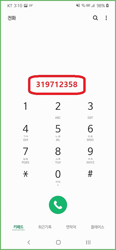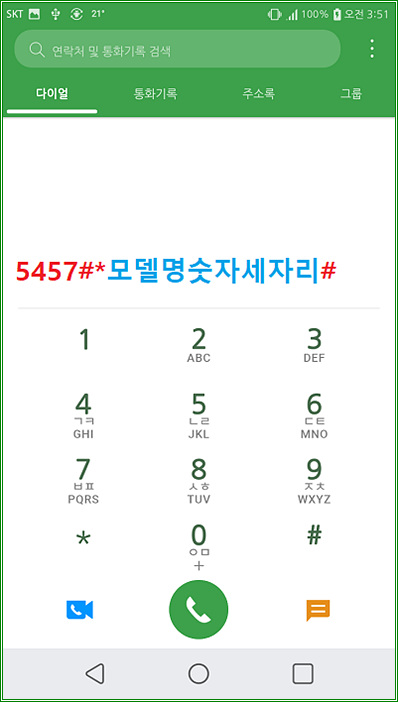 전화 앱을 실행하고 키패드에 5457#*모델명숫자세자리# 를 입력하자.