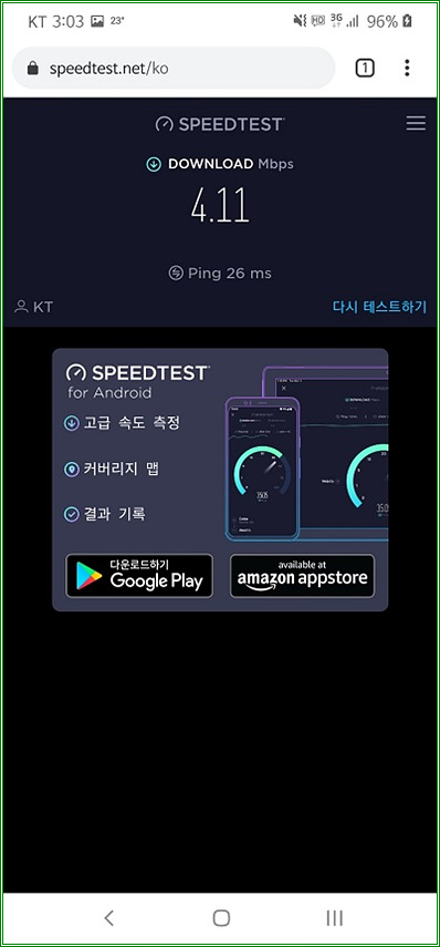 3G의 이론적인 최고속도는 14.4Mbps이지만, 보시다시피 4.11Mbps가 나왔다.