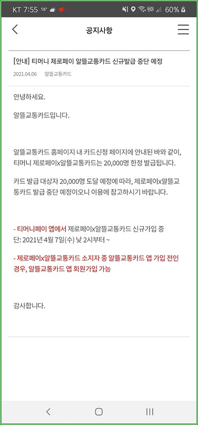 티머니 제로페이 x 알뜰교통카드는 카드 발급 대상자 2만명에 도달하여 2021년 4월 7일 오후 2시부터 발급이 중단되었다.