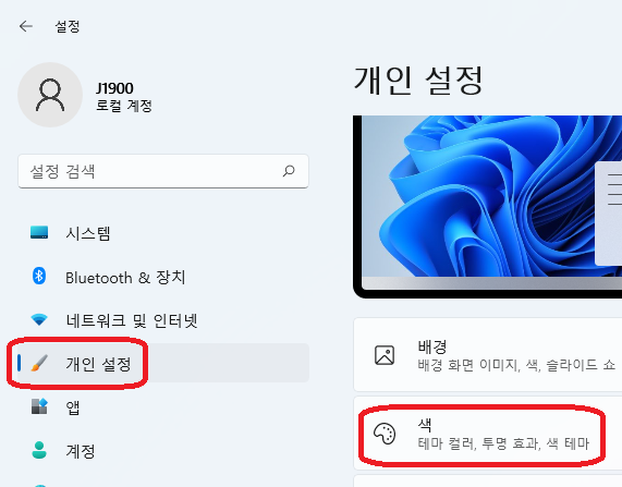 개인 설정에서 "색"을 클릭하자.