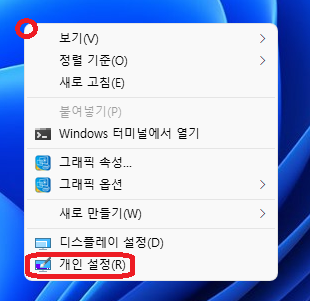 투명 효과를 끄려면 바탕화면 여백의 공간을 마우스 우클릭하고 "개인 설정"을 클릭하자.