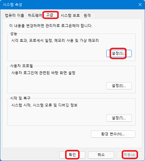 시스템 속성 창이 뜨면 "고급" 탭에서 "설정"을 클릭하자.