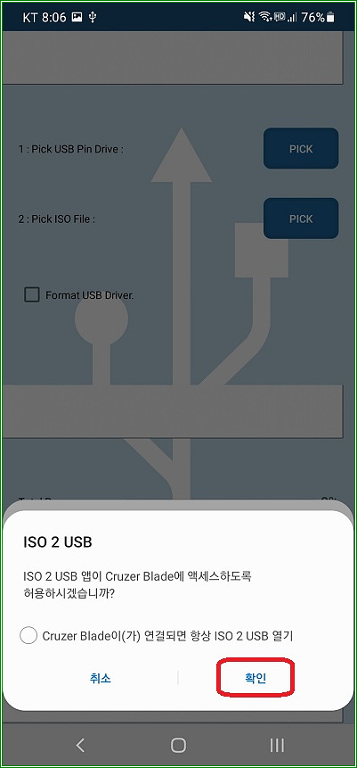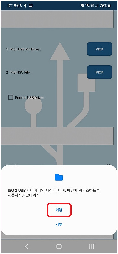 "허용"을 터치해야 ISO 2 USB 앱이 USB 메모리 사용권한을 획득할 수 있다.