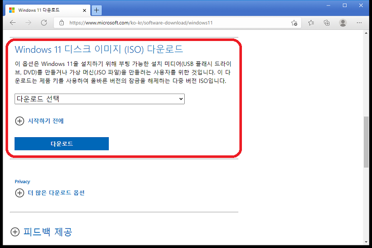일단 RUFUS 프로그램을 사용하려면 윈도우11 다운로드 페이지[바로가기]에서 .ISO 확장자 파일로 다운받아야 한다.