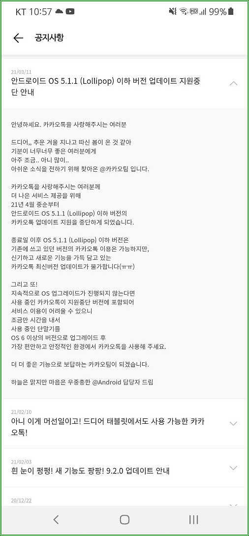 평소에 잘 확인하지 않는 카카오톡 공지사항을 보니 2021년 4월 중순부터 안드로이드 롤리팝에 대한 최신 카카오톡 업데이트가 지원되지 않는다.