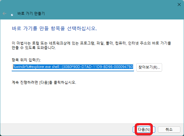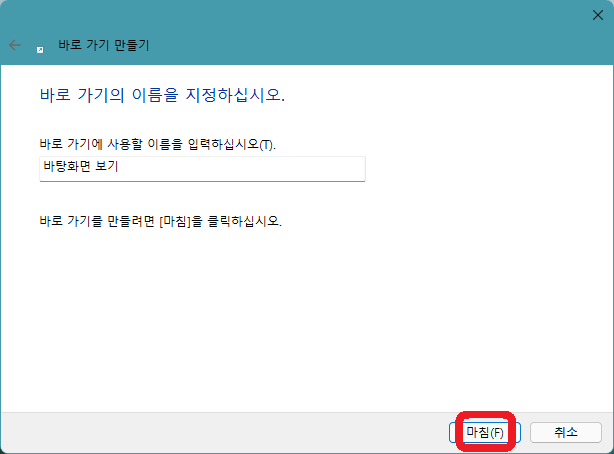 바로 가기 이름은 대충 "바탕화면 보기" 등 원하시는 대로 입력한 다음 "마침"을 클릭하자.
