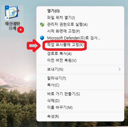 아이콘 모양을 바꾼 다음 마우스 우클릭하고 "작업 표시줄에 고정"을 클릭하자.