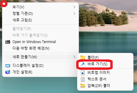 우선 바탕화면 아무 곳을 마우스 우클릭하고 "새로 만들기"-"바로 가기"를 클릭하자.