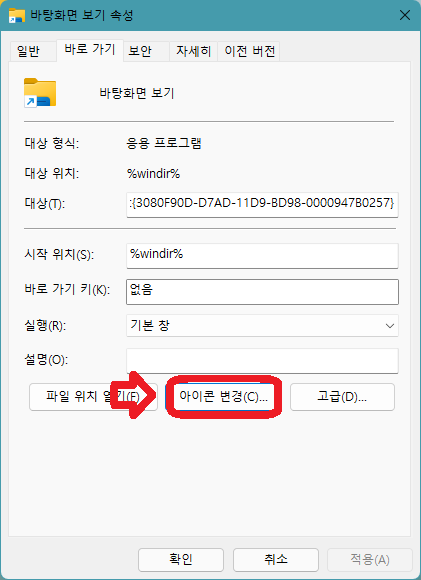 "바로 가기" 탭으로 들어가서 "아이콘 변경"을 클릭하자.