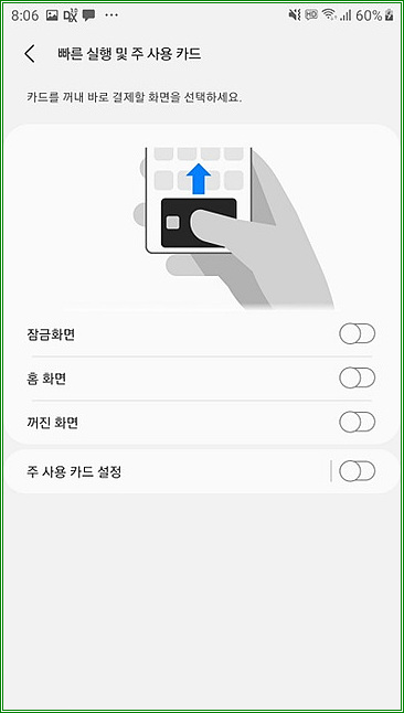 "빠른 실행 및 주 사용 카드"를 터치하자.